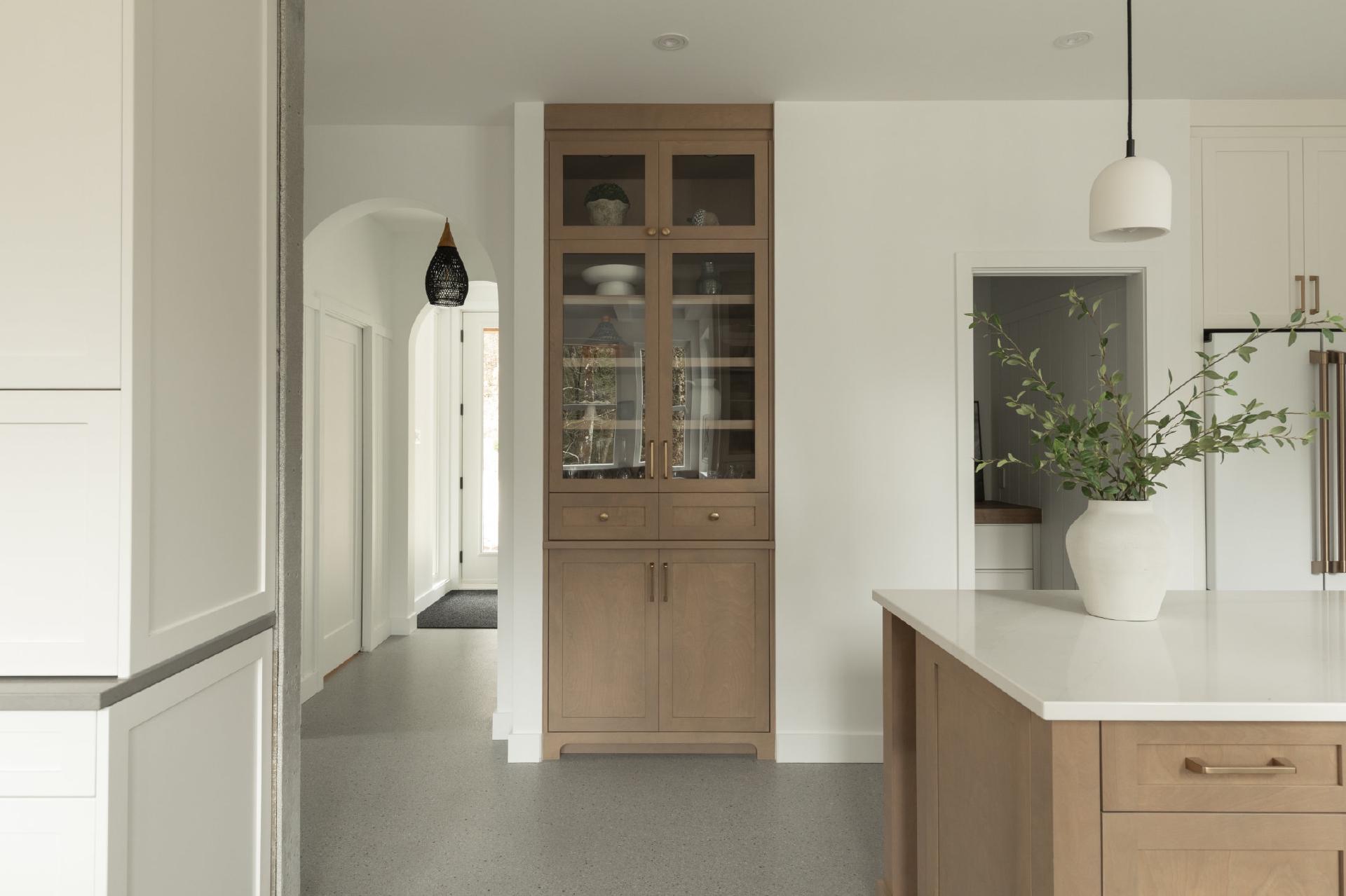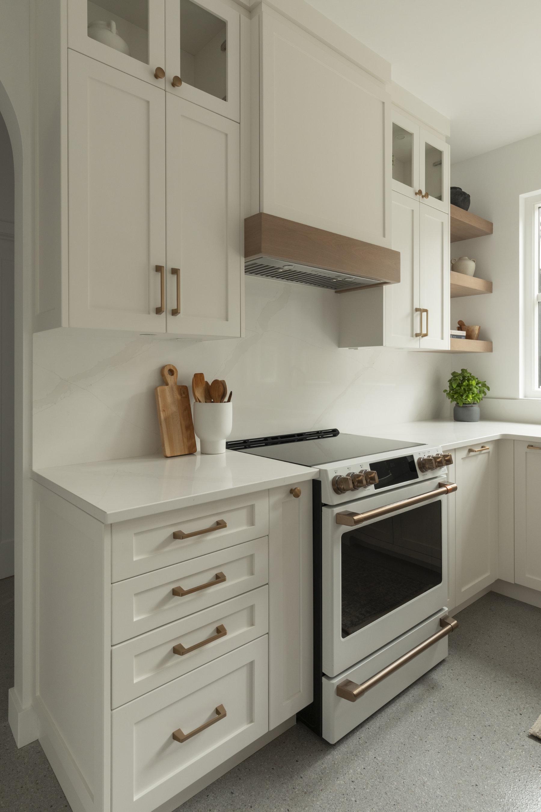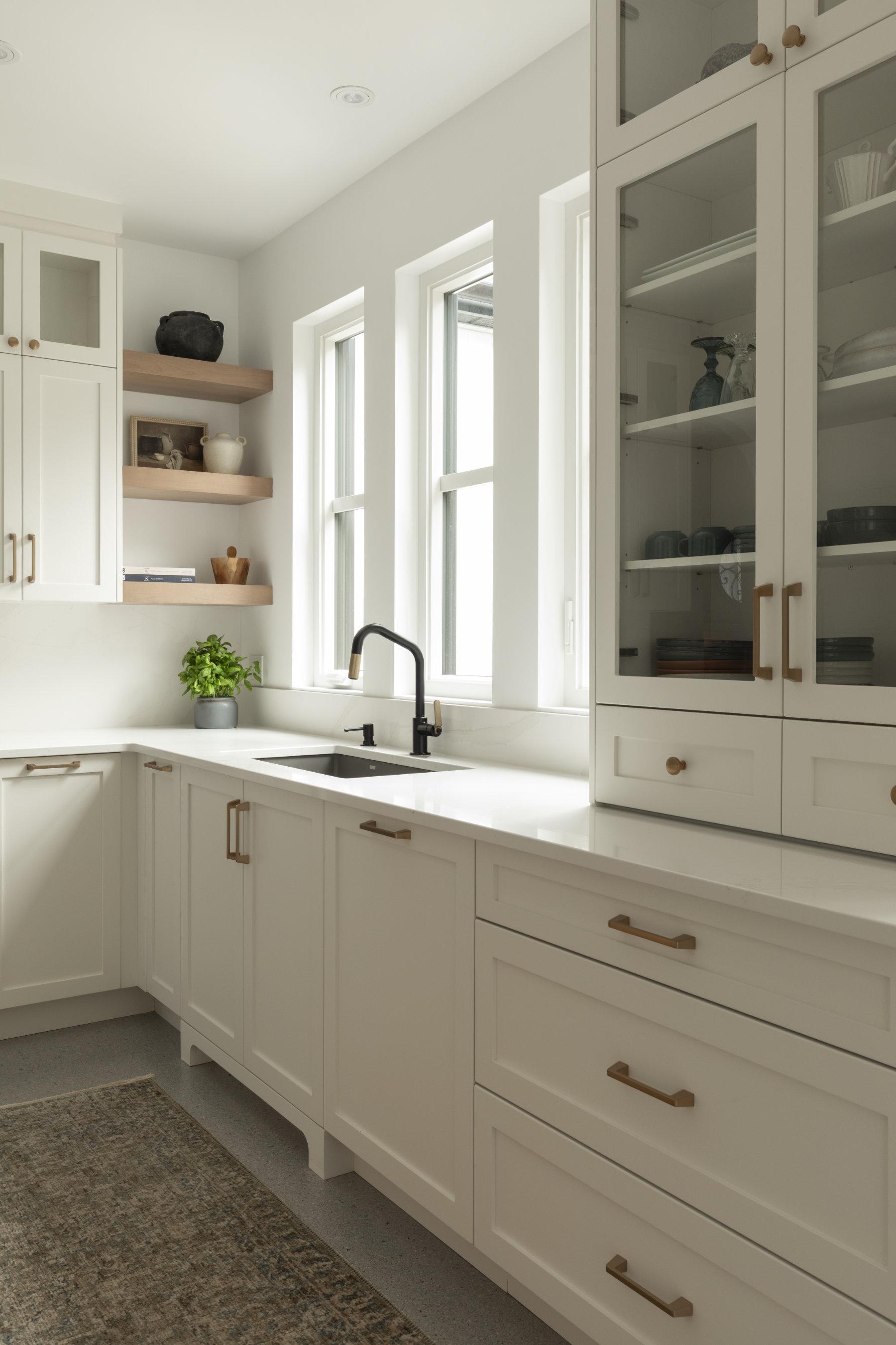 Chaque détail a été soigneusement pensé — de la quincaillerie raffinée aux vitrines en verre, en passant par les étagères ouvertes qui mettent en valeur vos objets préférés. La lumière naturelle abondante souligne la pureté des matériaux et la fluidité de l’aménagement, rendant la cuisine aussi agréable à vivre qu’à admirer.