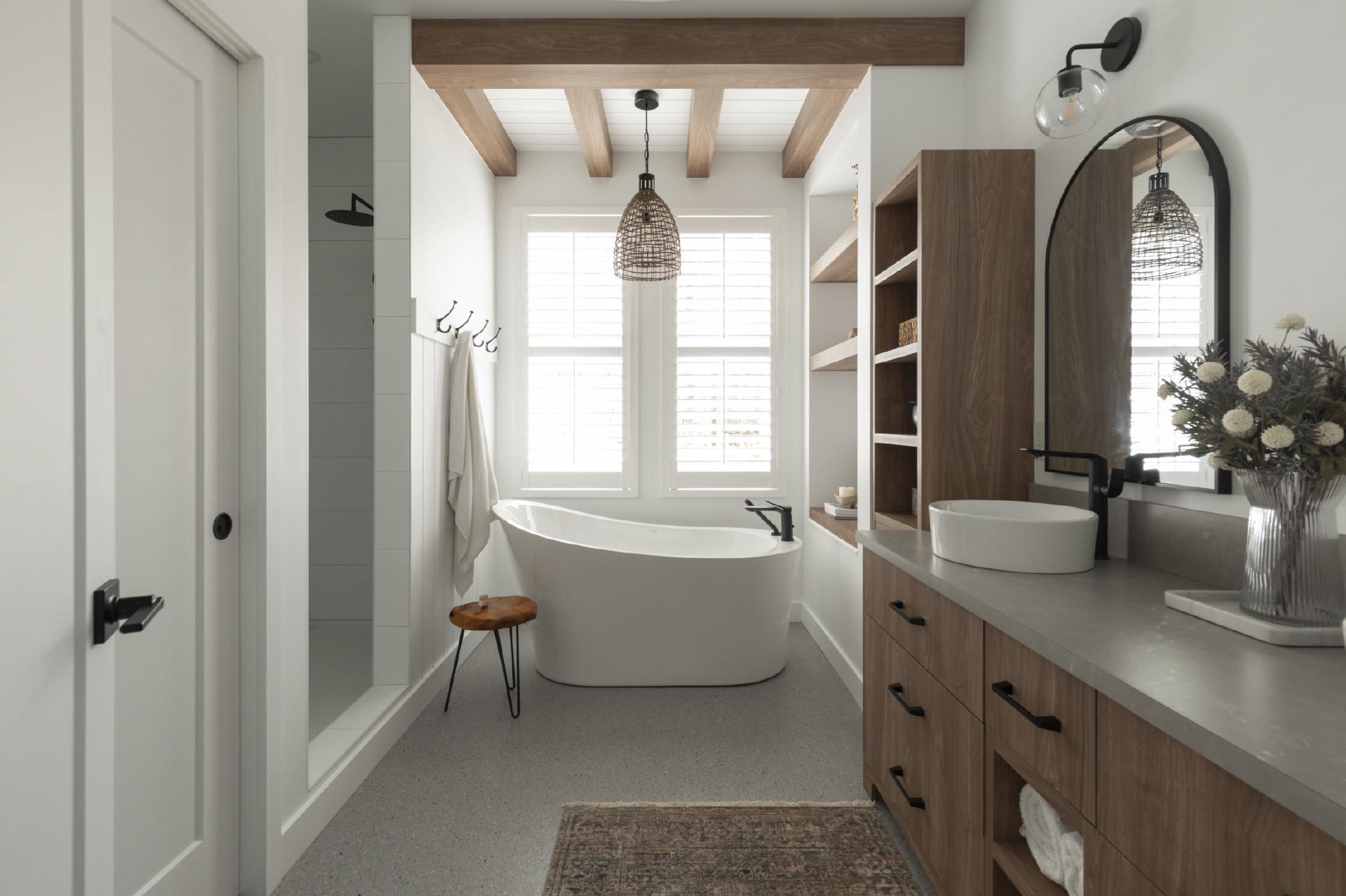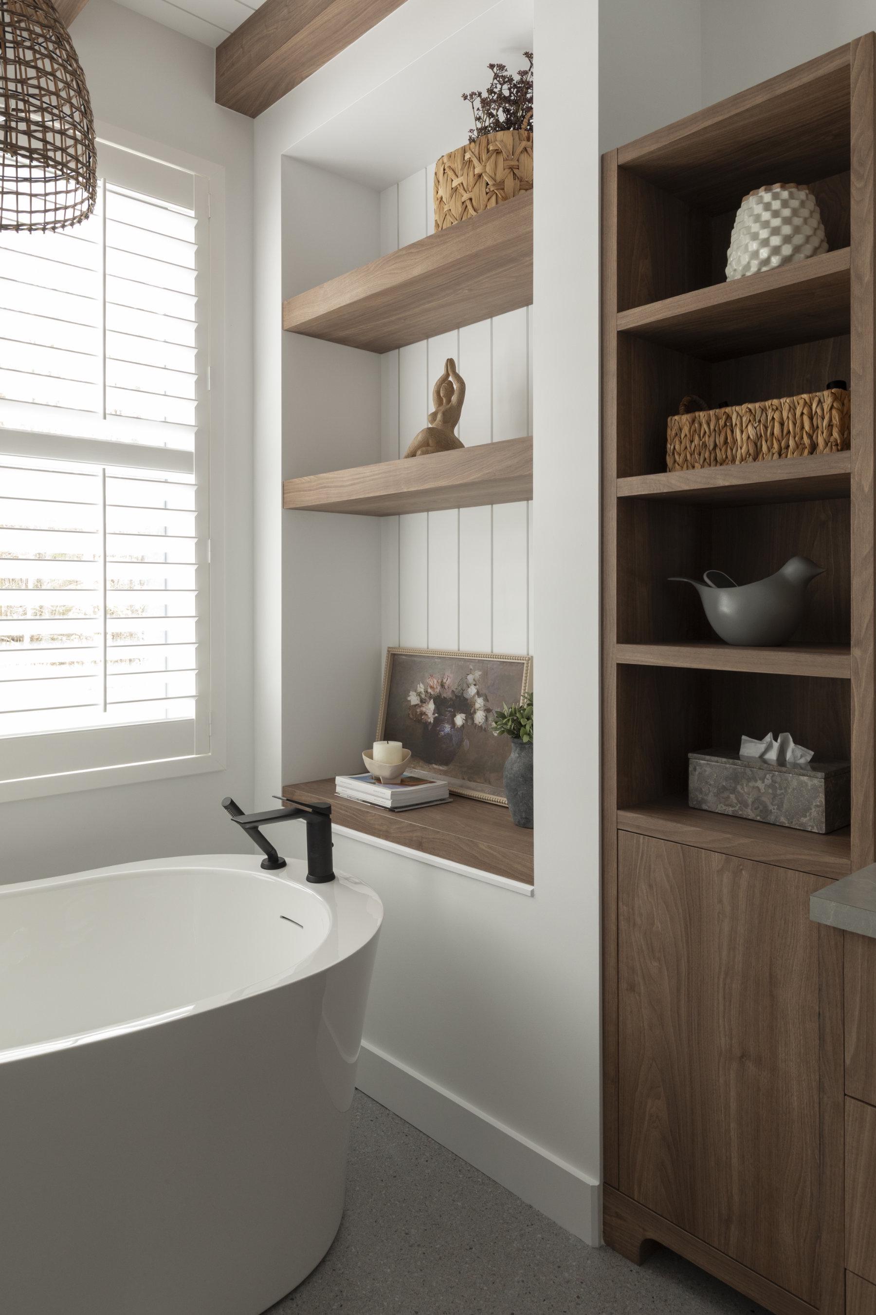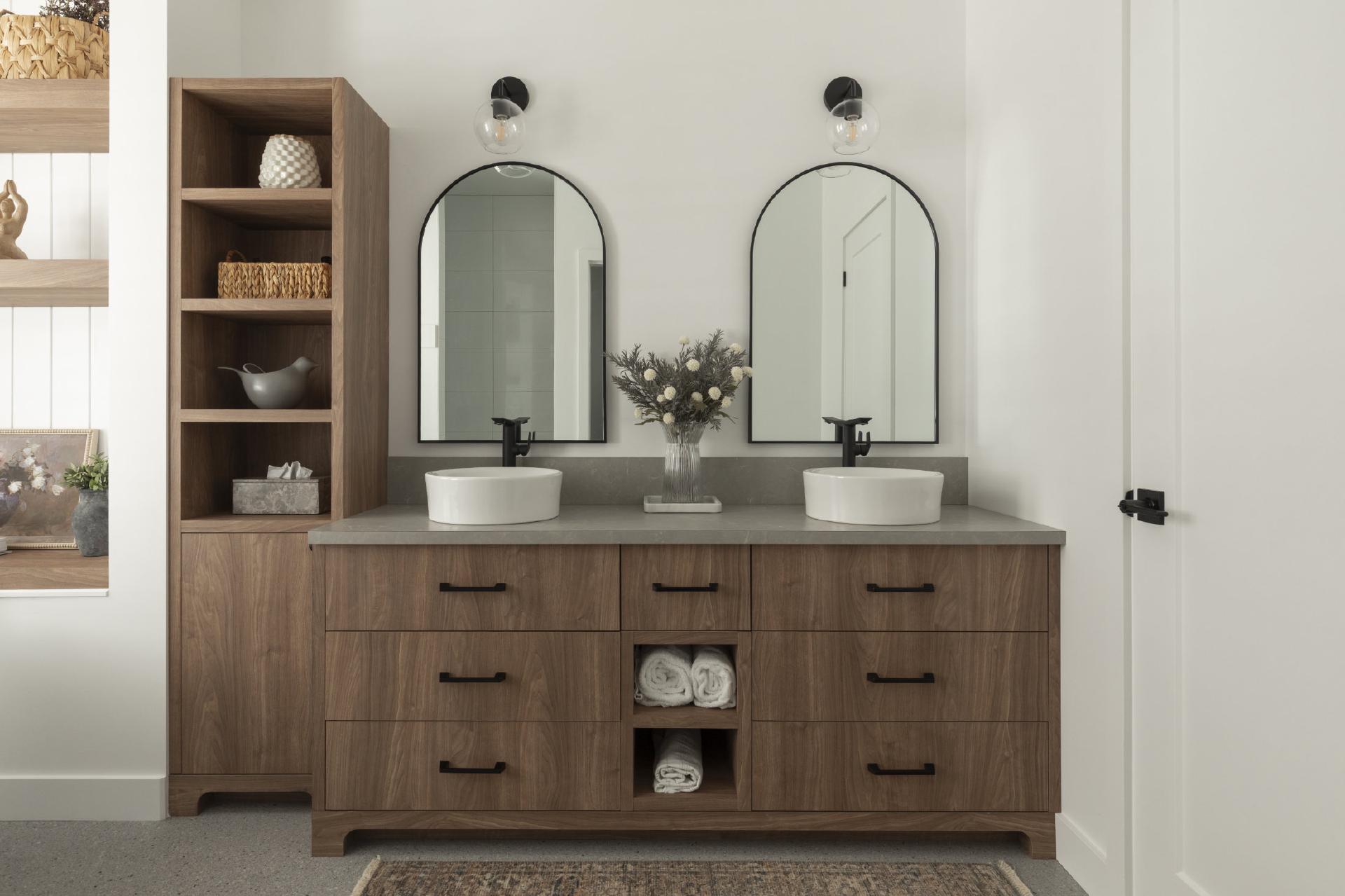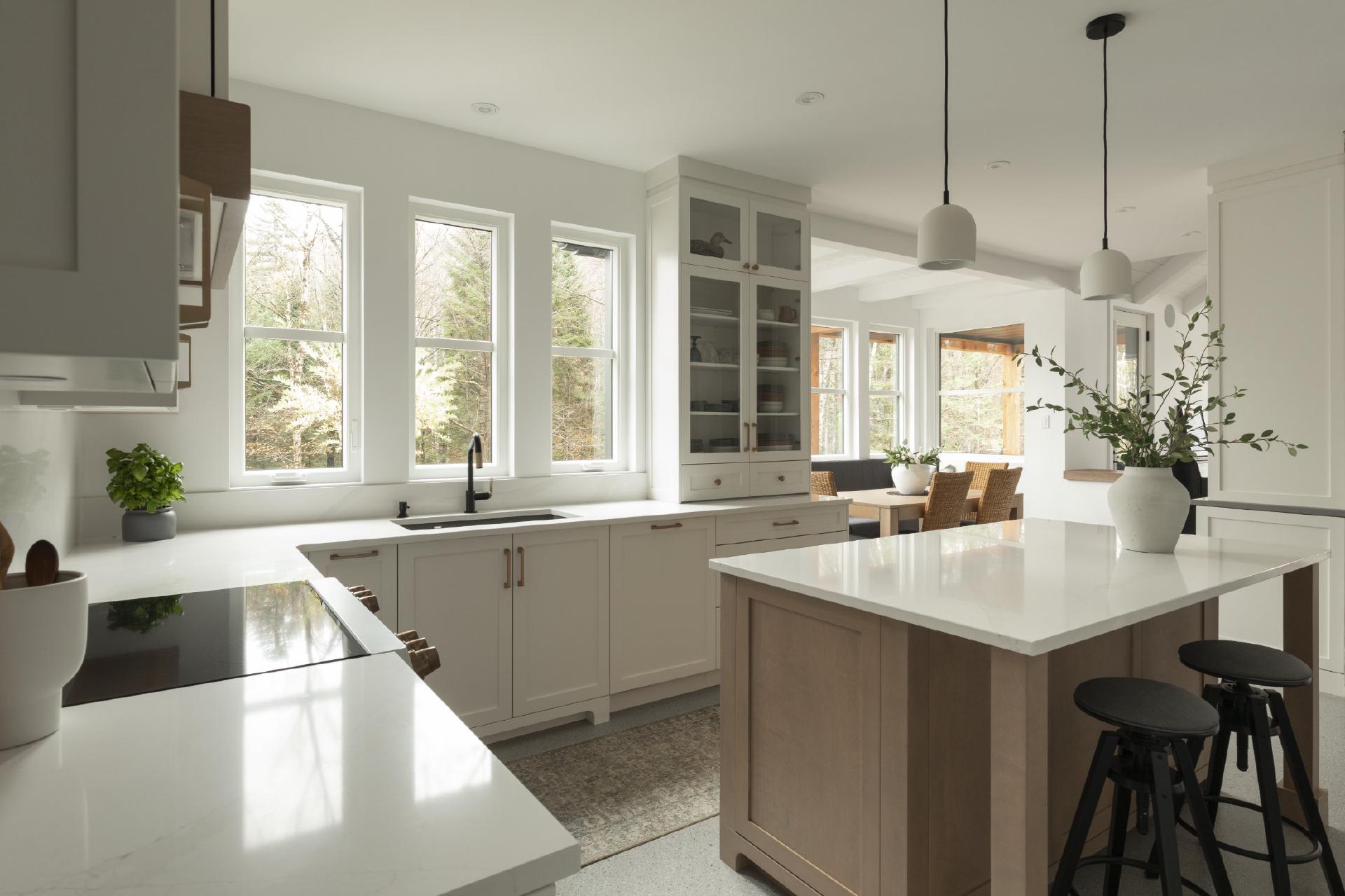 Cette cuisine se distingue par son équilibre parfait entre chaleur naturelle et élégance contemporaine. Les armoires sur mesure, finement travaillées, se marient à des finitions douces et lumineuses pour créer un espace accueillant et intemporel. Au centre, un îlot généreux en bois clair devient le cœur de la pièce : un lieu idéal pour préparer, partager et se rassembler.