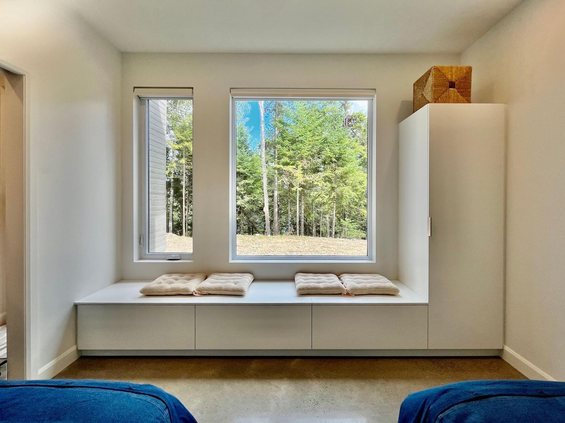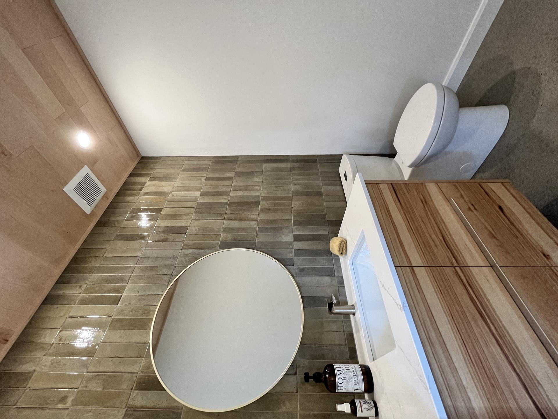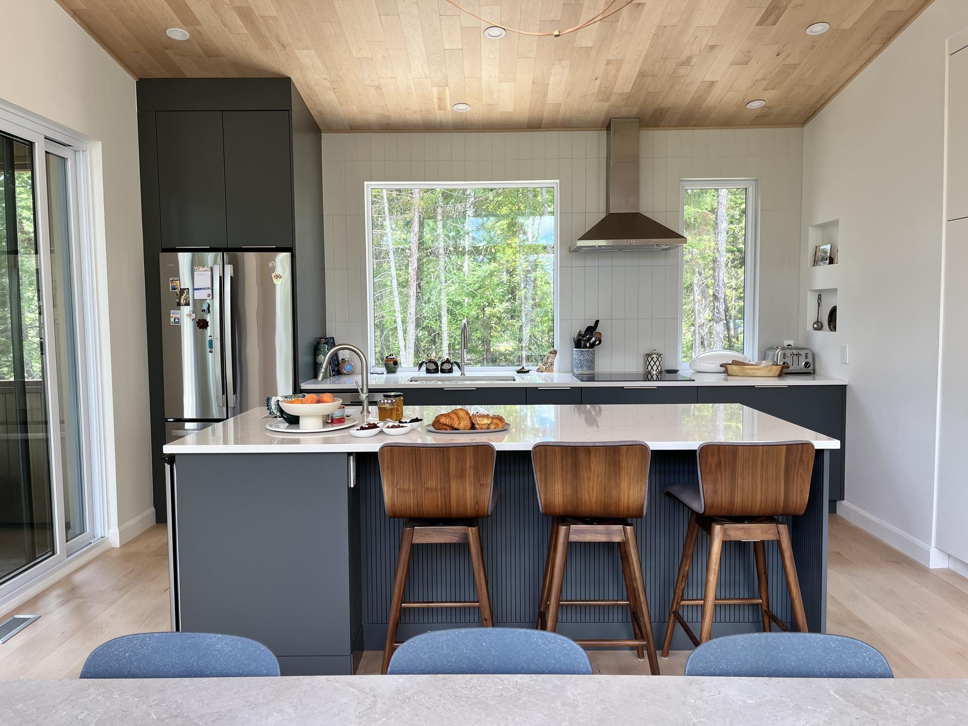 Le grand îlot central avec comptoir en quartz accueille la convivialité, tandis que les armoires encastrées maximisent le rangement sans alourdir l’espace. Le choix de tons neutres — du gris charbon au blanc mat — crée une atmosphère paisible, rehaussée par une lumière naturelle abondante grâce à de larges ouvertures sur l’extérieur.